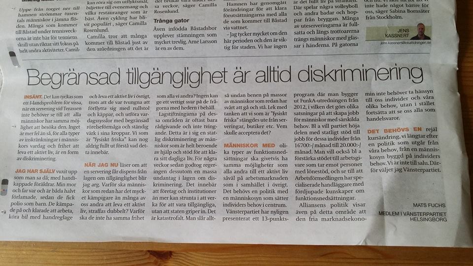När jag nu läser om att en servering får dispens från lagen om tillgänglighet blir jag arg. Varför ska människor som redan har det mycket kämpigare än många av oss andra att leva ett aktivt liv, straffas dubbelt? Varför ska de inte ha samma frihet som alla vi andra? Ingen kan ge ett vettigt svar på de frågorna med hedern i behåll. Lagstiftningarna på dessa områden är oftast bara rådgivande och inte tvingande. Detta är i sig en statlig diskriminering av människor som är helt beroende av hjälp och stöd för att klara sitt dagliga liv. För några veckor sedan godtog regeringen dessutom en massa undantag i lagen om diskriminering. Det innebär att företag och institutioner än mer kan strunta i att verka för att vara tillgängliga, utan att staten griper in. Det är katastrofalt. Man slår alltså undan benen på massor av människor som redan har svårt att gå och stå. Lek med tanken att vi som är ”fysiskt friska” stängdes ute från serveringar, butiker etc. Vem skulle acceptera det? Människor med olika typer av funktionsnedsättningar ska givetvis ha samma möjligheter som alla andra till ett aktivt liv såväl på arbetsmarknaden som i samhället i övrigt.