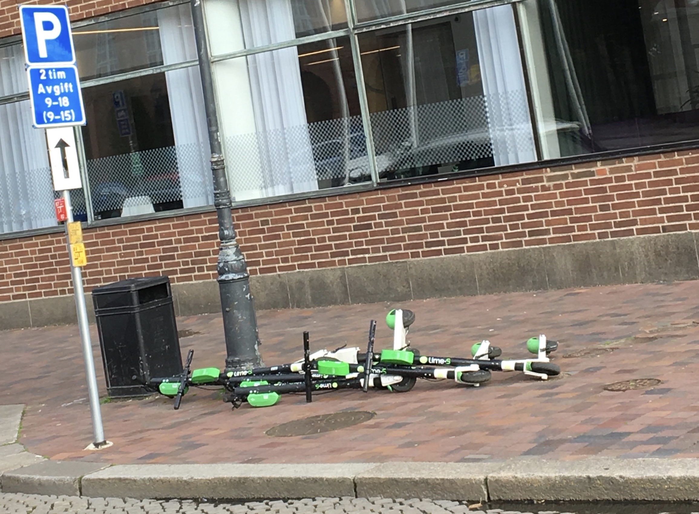 Dessutom, bolagen som hyr ut dessa elsparkcyklar tillåts använda trottoarerna som en kombination av gratis butiks- och lagerlokaler. Ja, en kan undra varför. När samtidigt den butik som vill ställa ut en gatupratare ska betala markhyra och också måste ta hänsyn till snubbelrisken.