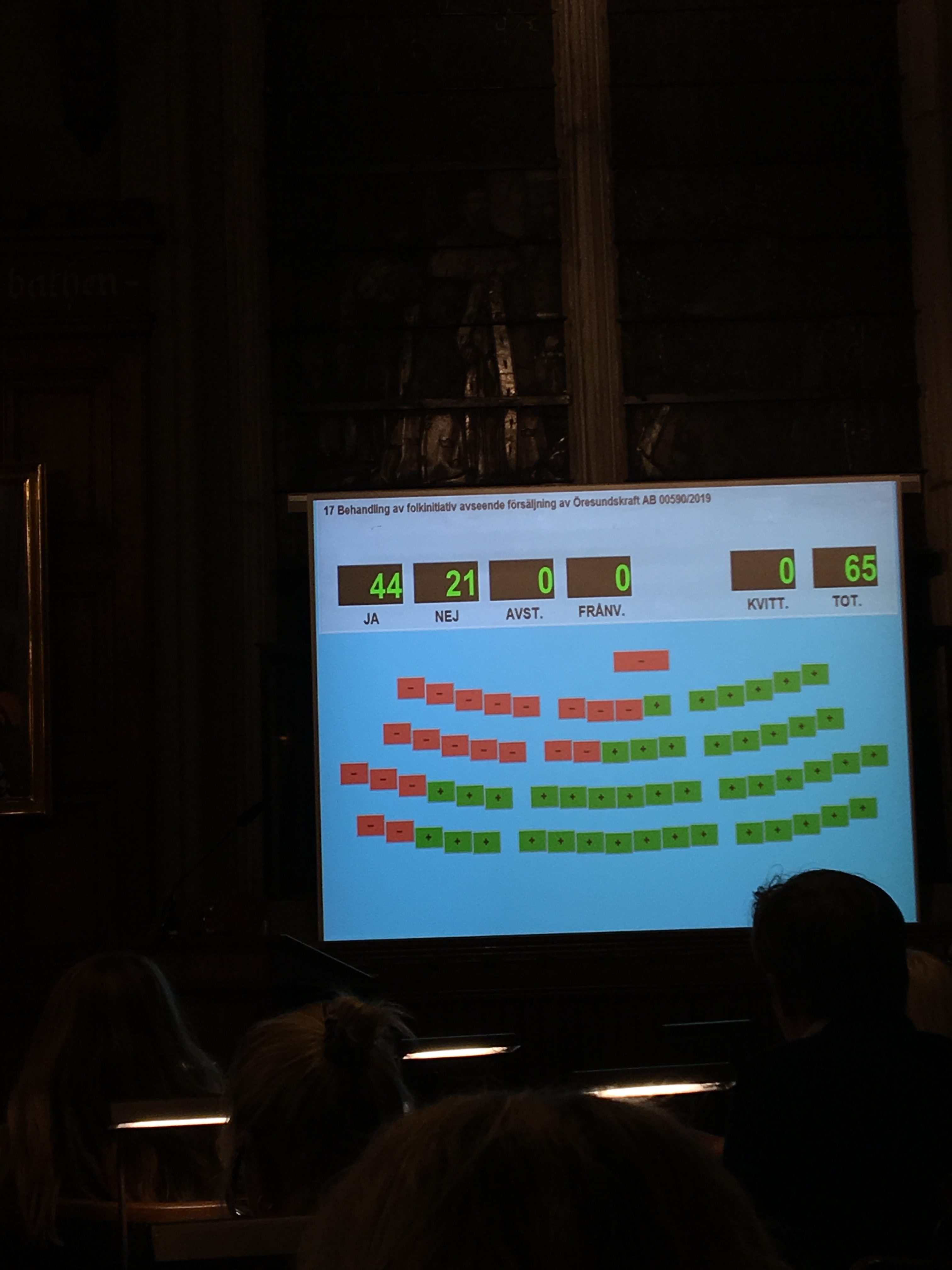 Moderaterna och Liberalerna hade i kommunstyrelsen röstat nej till en folkomröstning. Maria Winberg Nordström (L) förklarade beslutet med att de folkvalda har genom demokratiska val fått beslutande rätten och därför ska fatta beslut om Öresundskraft. Hon menade att den representativa demokratin utgör tillräcklig grund för beslut i frågan. Marcus Friberg (Mp) menade att det var en felaktig grund för argumentation som Maria framförde då det är precis det formellt korrekta och representativa sätt som Maria framförde som Folkinitiativet använt sig av för att väcka frågan, då blir det märkligt att underkänna initiativet på den grunden.