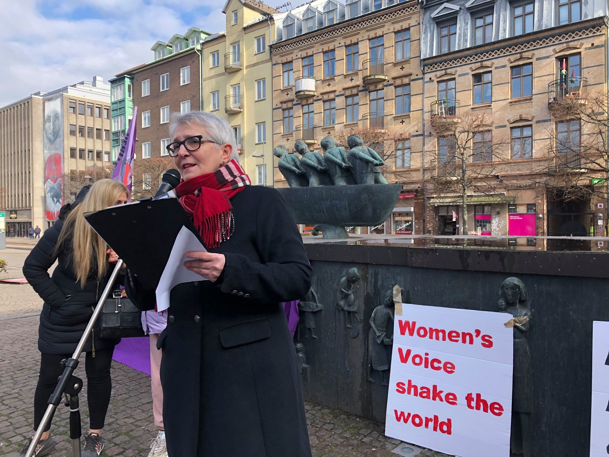 Tal av Ingrid Mattiasson Saarinen på Kulturpunkten Dalhems Centrum den 8 mars 2020, en manifestation initierad av Iranska kvinnoföreningen i samarbete med flera kvinnoföreningar och Vänsterpartiet Helsingborg