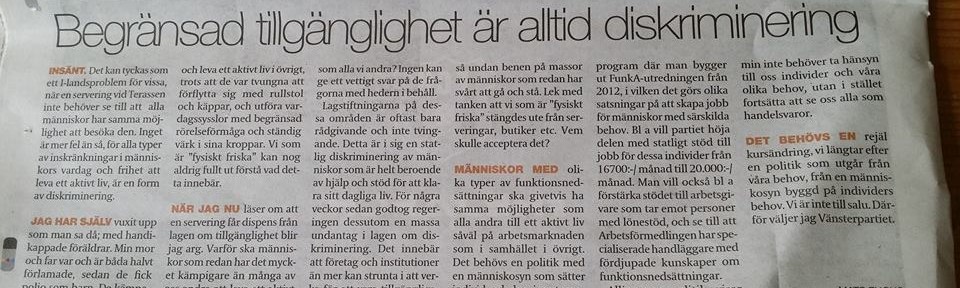 När jag nu läser om att en servering får dispens från lagen om tillgänglighet blir jag arg. Varför ska människor som redan har det mycket kämpigare än många av oss andra att leva ett aktivt liv, straffas dubbelt? Varför ska de inte ha samma frihet som alla vi andra? Ingen kan ge ett vettigt svar på de frågorna med hedern i behåll. Lagstiftningarna på dessa områden är oftast bara rådgivande och inte tvingande. Detta är i sig en statlig diskriminering av människor som är helt beroende av hjälp och stöd för att klara sitt dagliga liv. För några veckor sedan godtog regeringen dessutom en massa undantag i lagen om diskriminering. Det innebär att företag och institutioner än mer kan strunta i att verka för att vara tillgängliga, utan att staten griper in. Det är katastrofalt. Man slår alltså undan benen på massor av människor som redan har svårt att gå och stå. Lek med tanken att vi som är ”fysiskt friska” stängdes ute från serveringar, butiker etc. Vem skulle acceptera det? Människor med olika typer av funktionsnedsättningar ska givetvis ha samma möjligheter som alla andra till ett aktivt liv såväl på arbetsmarknaden som i samhället i övrigt.
